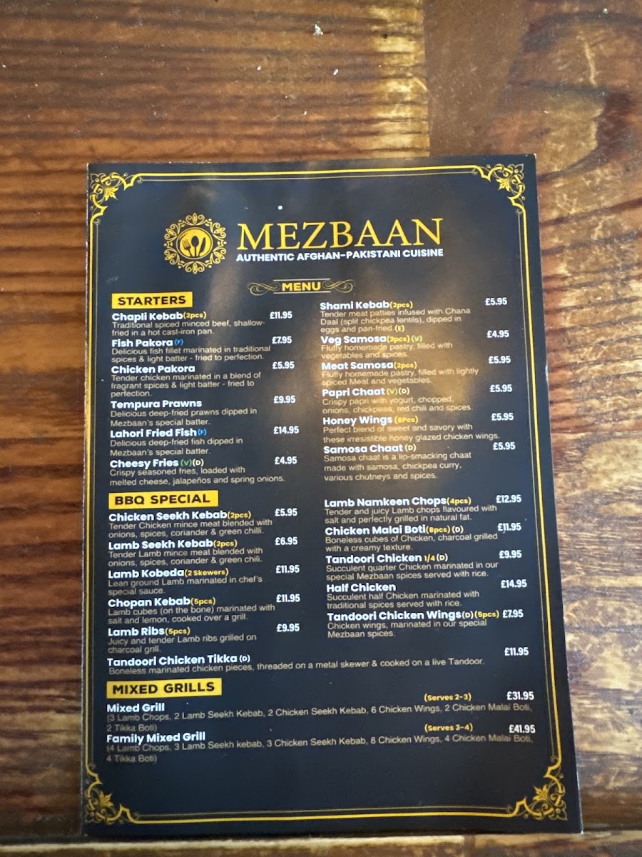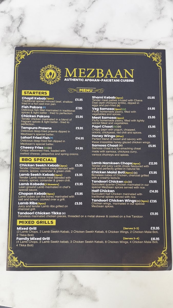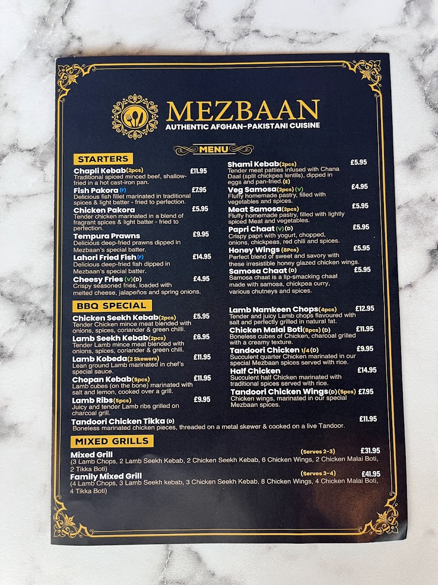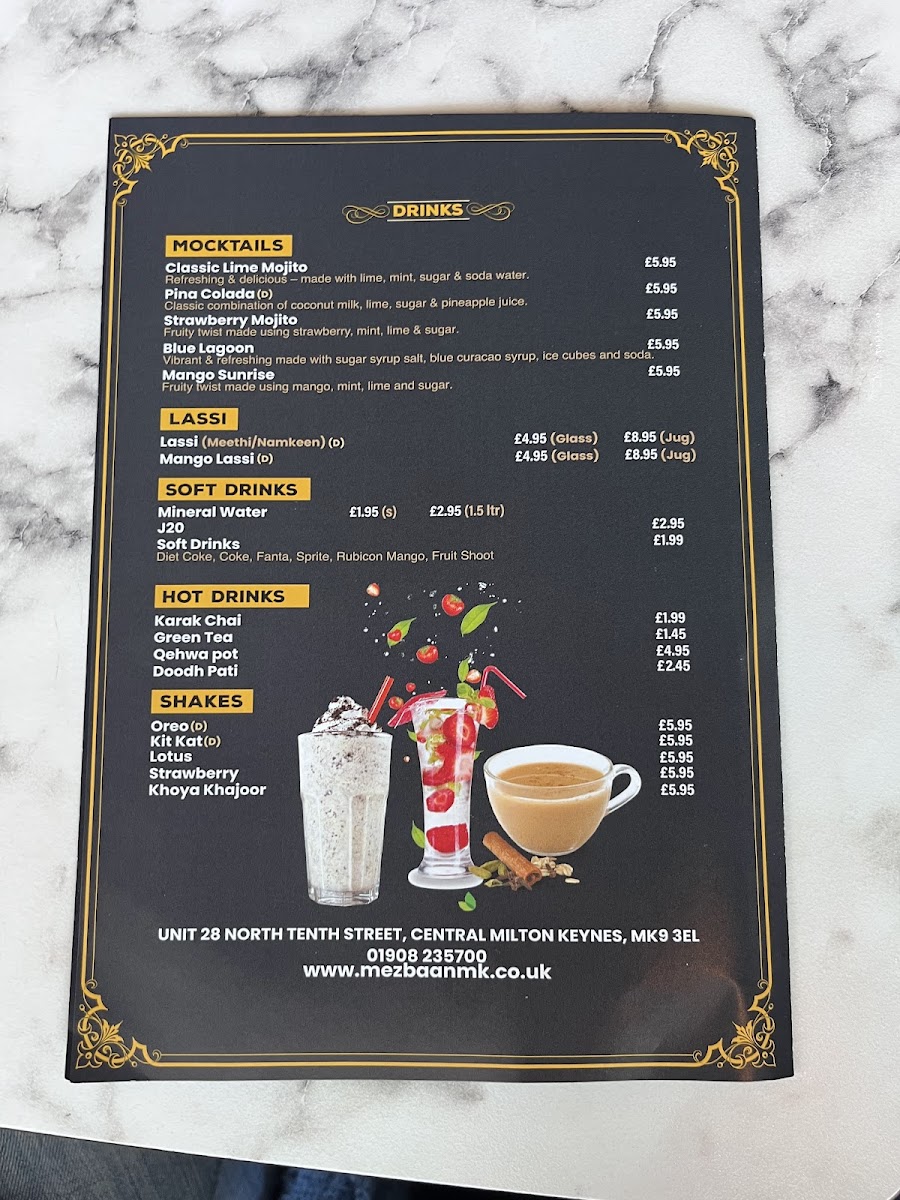 For those seeking something refreshing, Mezbaan offers a selection of mocktails like the Classic Lime Mojito and Pina Colada, each priced at £5.95. Don't miss their indulgent shakes, featuring favorites like Oreo and Kit Kat, also at £5.95.